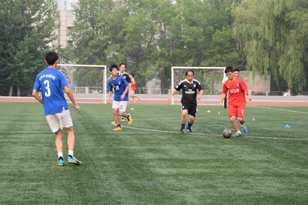 参赛队伍分为教师代表队和毕业生代表队。 比赛伊始,各位队员马上就进入状态。老师们抛去了平时的一丝不苟,变得张扬洒脱,让大家看到与三尺讲台上不一样的老师。员工们也一改平时面对老师们时的恭敬有礼,赛场上不分师生,球员们都奋力拼搏,你争我抢,场上形成了争锋相对的局面,两方队员平分秋色。比赛期间,双方都展现出了良好的足球技能和体育素养。队员之间配合默契,凭借巧妙的攻略和熟练的脚法,多次突破对方防线,破门得分,赢得了现场观众的阵阵掌声和喝彩。比赛在师生热烈的掌声和欢呼声中落下帷幕,教师足球队以微弱优势取胜。赛后,员工与老师相互拥抱后合影留念,绿茵场上洋溢着浓浓的师生情。