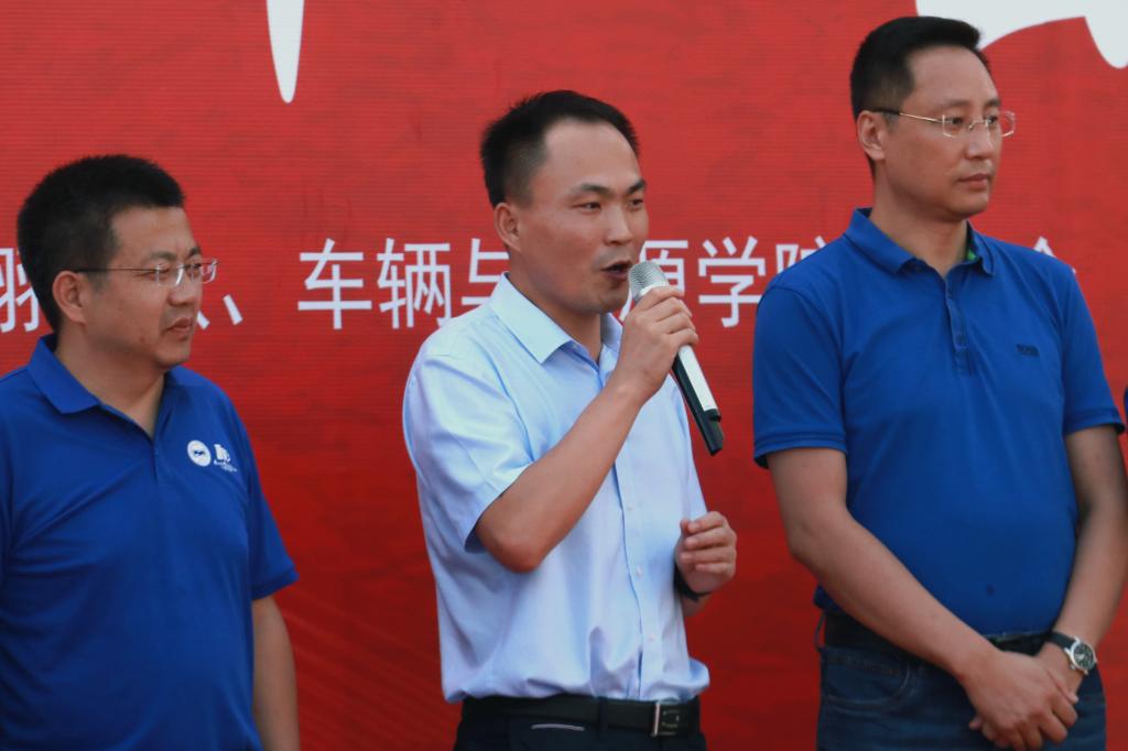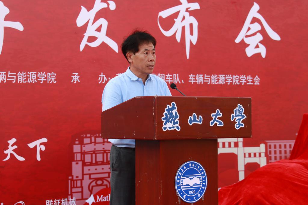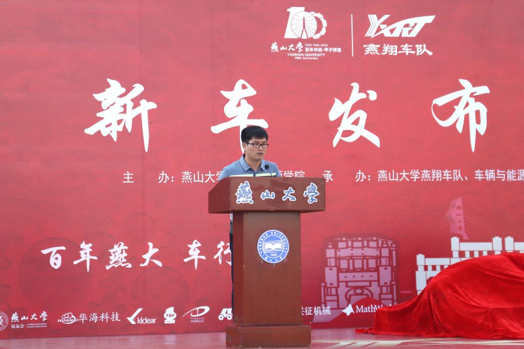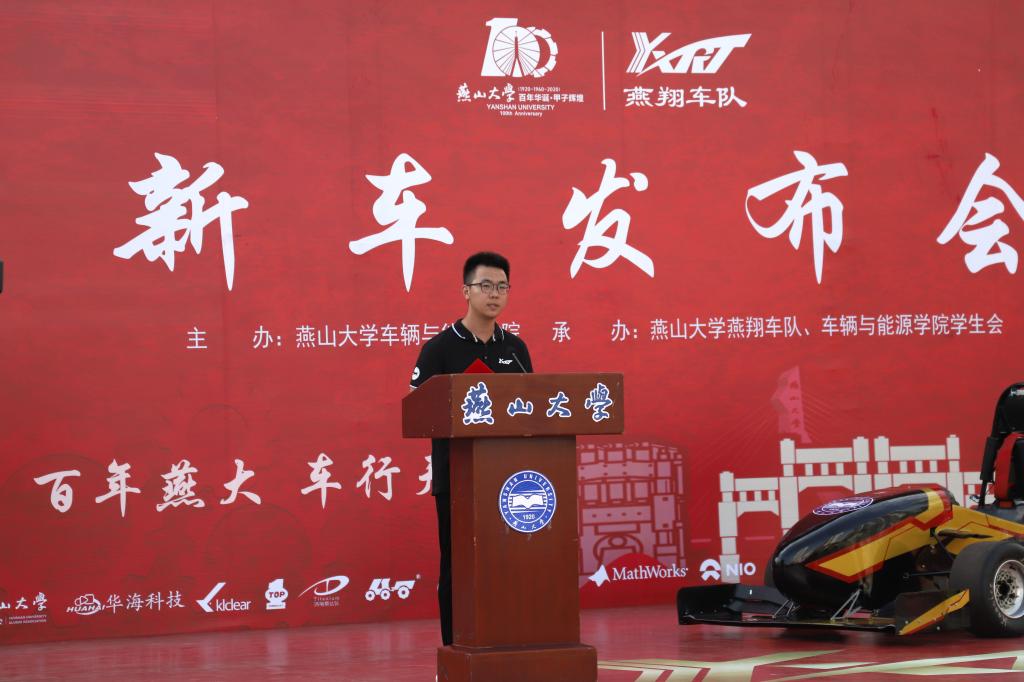 燕翔车队队长杜云浩在新车揭幕仪式后上台发言,表达了对所有领导、赞助商和员工的感谢,介绍了新车的构造、性能和自主设计部分。在发言最后他表明了今后燕翔车队的发展方向及对未来的期许。