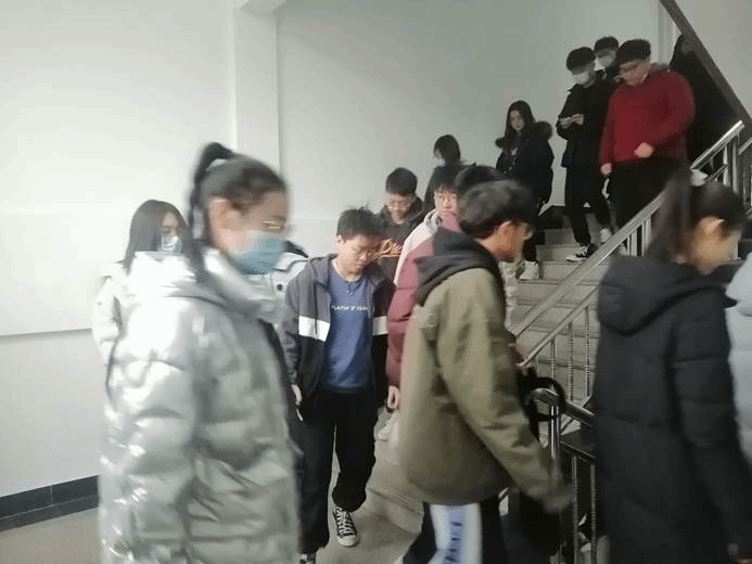 模拟地震发生时,参与演练的同学有序向室外“撤离”