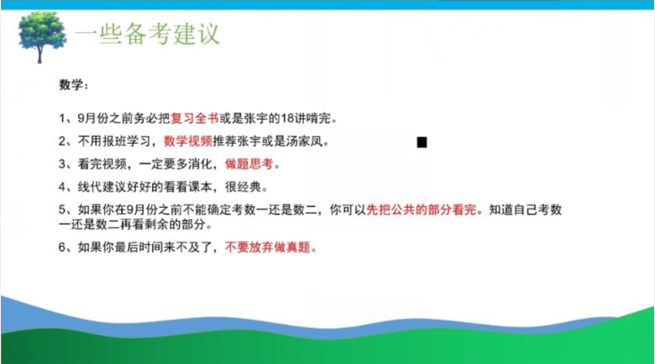 张玉宾介绍了自己选择目标院校的过程,确定好自己的目标后就是不断地奋战准备。随后他分学科介绍了自己的复习经验,针对英语的不同题型推荐了自己关注的公众号,政治分享了自己的复习题和复习时间,数学则是付出最多时间的科目,要注重基础的学习和押题卷的练习,多做真题。最后交流了考研的过程确实很苦,但是日后回想收获满满,希望同学们都能取得佳绩。