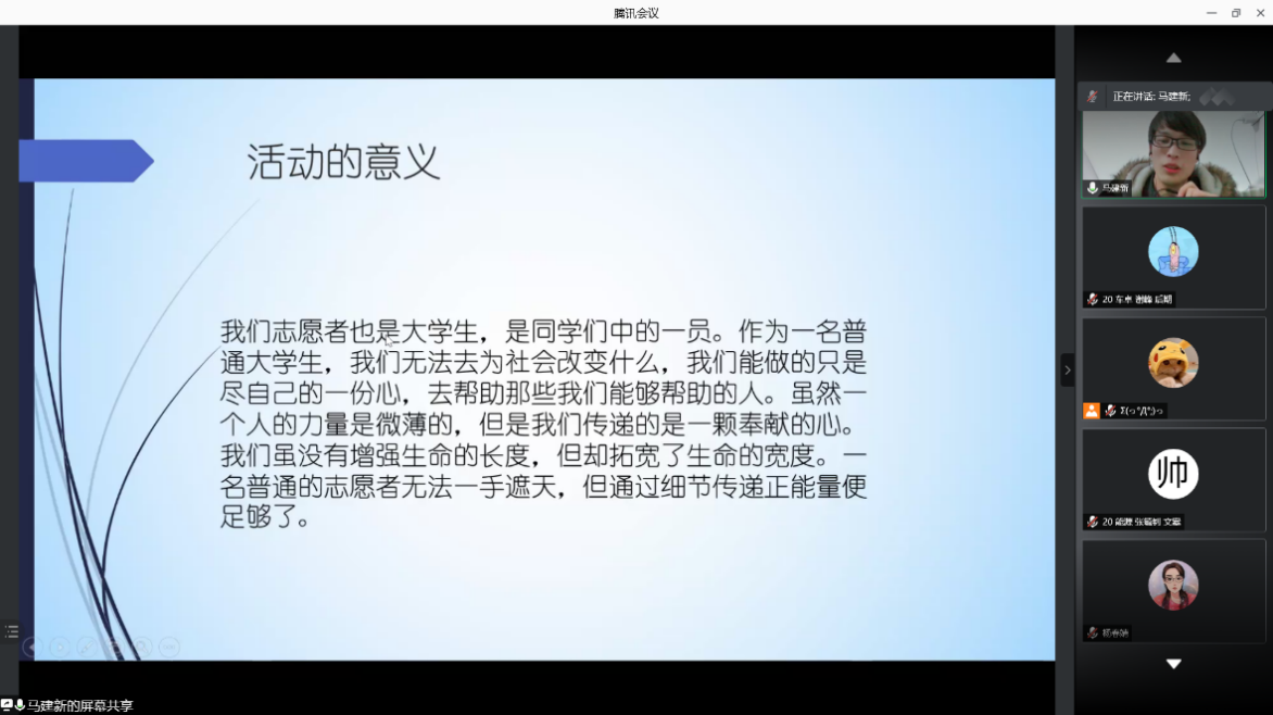 马建新对公司青年志愿者协会进行了简要介绍,分享2020年青年志愿者协会组织参与的一系列志愿活动,他认为:“作为一名合格的老员工,我们应当将自己的青春与热血绽放在尽己所力,奉献他人的事情上”,点明了志愿服务的宗旨——奉献。