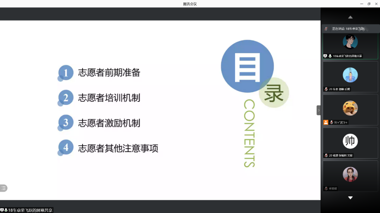 荣飞跃为所有参加培训志愿者讲解培训的前期准备、培训机制与激励机制。他讲解道:“我们所有安排的一切都是为了让大家能更好的投入到培训当中,为以后的志愿服务做好准备。”通过讲解,志愿者们表示充满干劲,对未来的活动也更有信心。