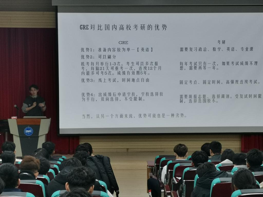 施而修老师分享了他在美国留学的经历,主要包括以下三个部分。第一,关于GRE考试的内容,施而秀老师给大家介绍了GRE的考试科目及时间,鼓励大家积极备考,经济条件允许下可以多去尝试,第二,关于申请材料的内容,施而修老师介绍了美国高校普遍需要的材料,提醒同学们多注意平时成绩,这是决定申请是否成功的关键,第三,关于留学期间获得资助的方法,施而修老师讲到,获得导师免除学费及工资是最好的受资助方法,提醒同学们在申请留学时要提前与导师联系,协调好受资助方式。最后施而修老师强调了留学不是为了更好的教育,而是为了体验不同的教育,开阔视野和思路。
