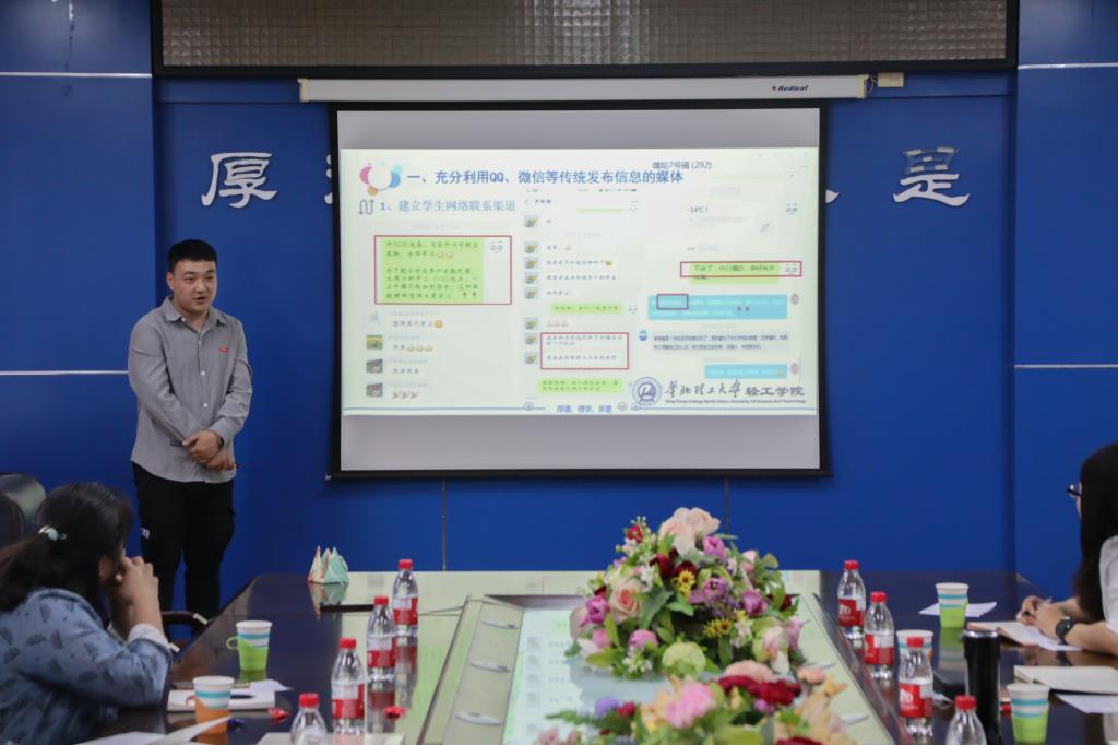 王晨老师重点分享了开展网络思政教育的几种思路,他提出辅导员做思政工作不仅要充分利用QQ、微信等传统媒体,还要利用表情包、直播、问卷星等手段,利用“两微一抖”、工作室、新媒体工具等途径开展网络思政教育。王老师的汇报中结合实例,分享了自己与员工之间的趣事,为现场老师们在思政建设、网络育人等方面提供了宝贵经验。