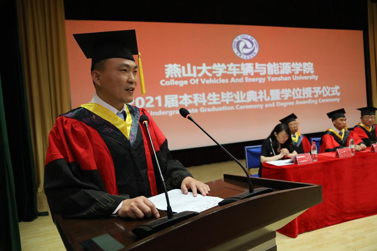 教师代表郑黎明老师以“继续前行”为题,满怀深情寄语毕业生。他和毕业生一起回顾的四年成长经历,希望大家能在前行中回忆青春,记得大学四年间收获的成功与失败,都会成为未来的记忆财富;在前行的路上保持激情与斗志,奋勇拼搏,永不言弃;在前行中也要注重生活,珍惜时光,享受生活的美好。