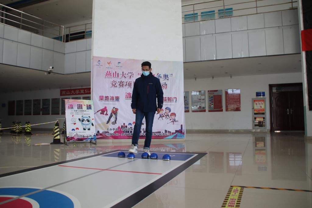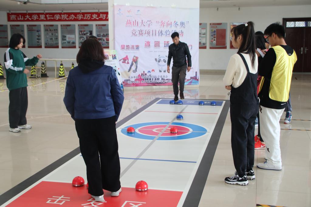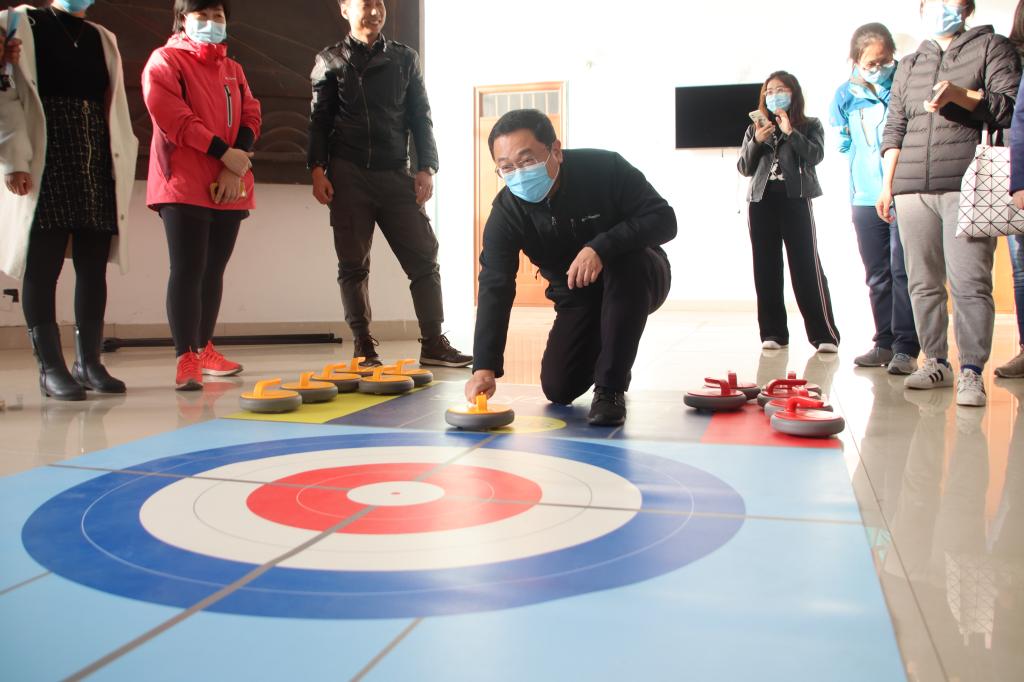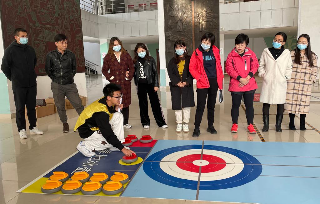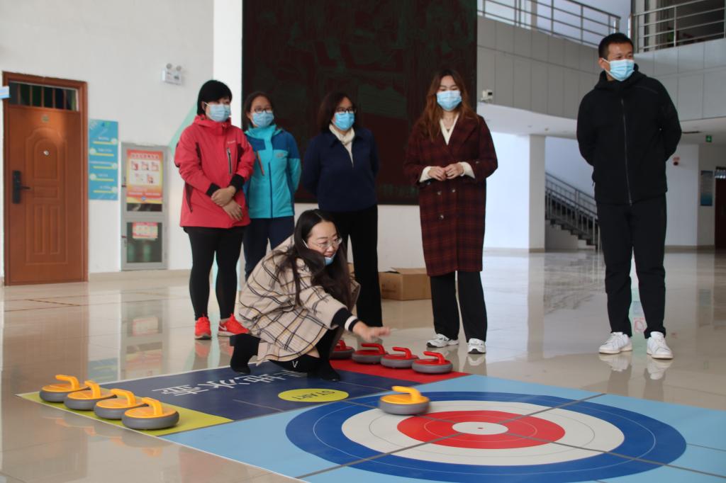 首先进行的是冰壶项目的比赛。冰壶作为冬奥会正式比赛项目,因其神秘与高雅,也被称为“冰上国际象棋”。比赛开始,参赛教师迅速进入角色,手握把手,单膝触地,神情专注,轻轻一推,冰壶就在推力下向前滑动,每一次清脆的碰撞声都带来场上老师们的热烈欢呼,每一次反转都让老师们体验到这个项目的趣味和魅力。