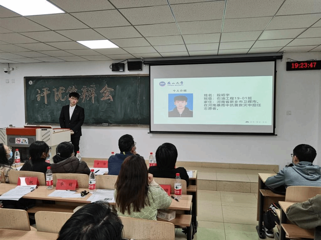 六位候选人参与“三好员工标兵”评优答辩。候选人之一2019级石油工程2班代嘉怡同学以“脚踏实地,勇攀高峰”为题,展开了精彩答辩。代嘉怡同学注重学用结合,不断拓展自我的学科竞赛以及科研能力,获得学科竞赛类国家级奖项、省级奖项若干。作为生活委员,每周号召寝室进行大扫除,尽心尽力做好安全隐患排查、疫情防控、班费收缴等本职工作,积极组织并参与班级各项活动;作为院新媒体中心文创部负责人,带领文创部发表推文累计857篇。