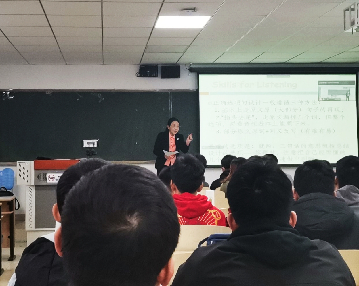 讲座伊始,刘老师为初次接触大学英语四级考试的2021级新生介绍了考试流程、题型构成和分值明细。在听力部分讲解中,刘老师指出,英语四级考试听力部分“听到就是正解",按照题目的顺序边听边选,听到与选项一致内容,马上勾选,做到“耳到、眼到、手到”是听力部分通关的致胜法宝。英文开头多为主题句,所以刘老师建议同学们考试一旦开始,尽快进入状态,通过文章首句把握文章主题,稳住心态。刘老师强调,听力中出现逻辑转折词和态度提示词需要重点关注,它们往往是考官倾向的出题处,随后对高频提示词进行了归纳总结。