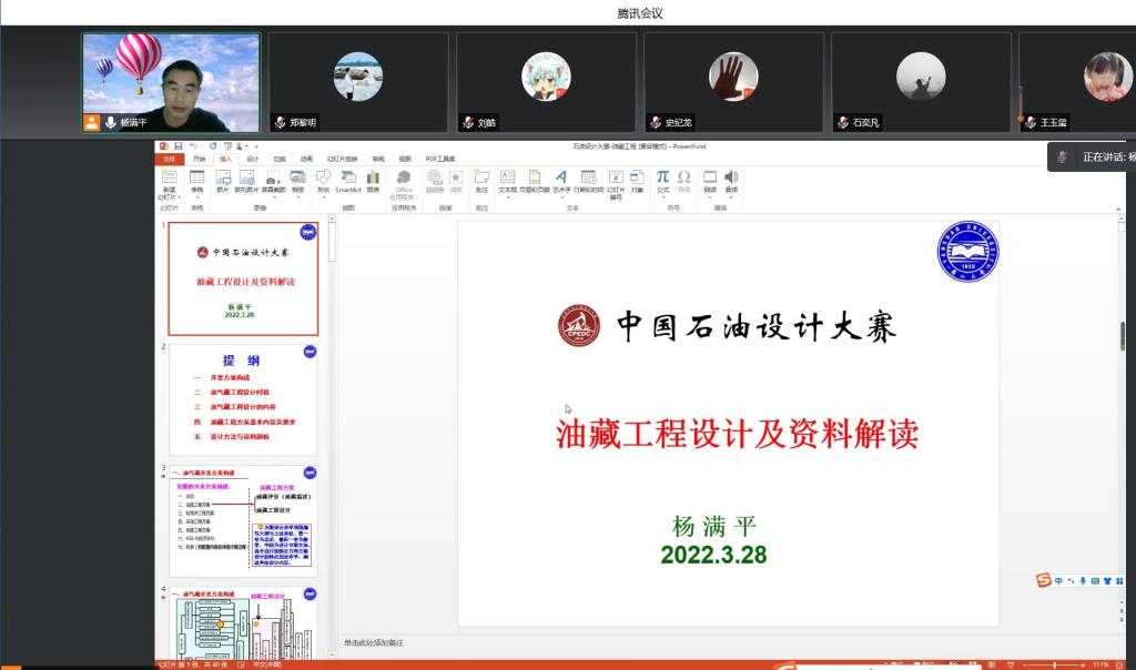 2022年3月28日19:30,基于第十二届“中国石油工程设计大赛”校内选拔赛,PA集团官网举办了油气藏工程设计单元的线上指导讲座。为遵守疫情防控需求,本次讲座通过腾讯会议线上开展。本次讲座由PA集团官网副经理、石油与天然气工程教授杨满平老师主讲,六十余名报名参赛的本科生及研究生参与直播。