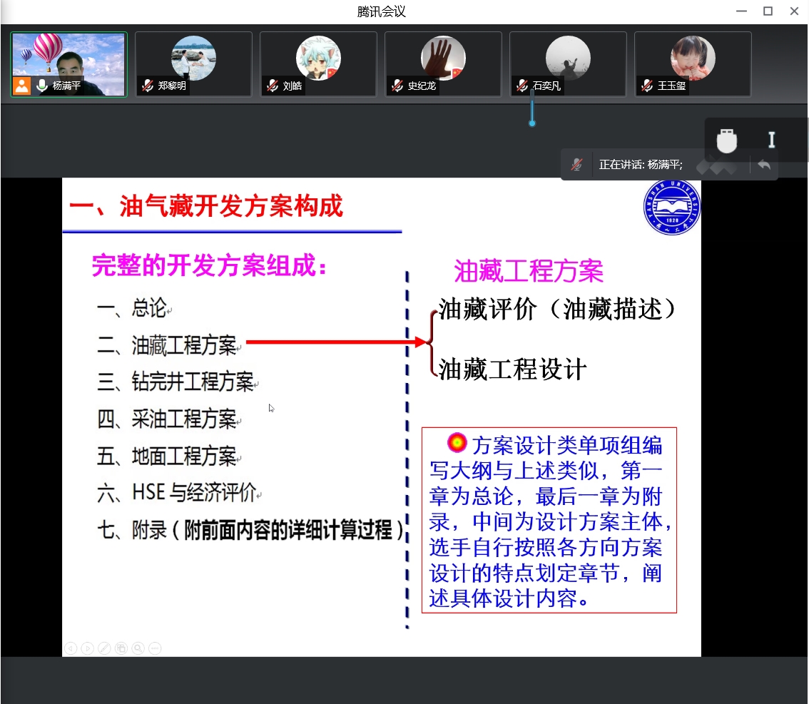 杨满平教授就近年来能源行业的发展趋势,对本次大赛进行在线赛题解读,从油气藏开发方案的构成入手,讲解了油气藏工程设计的时机和内容,对油气藏开发方案的设计流程进行了细致的讲授。