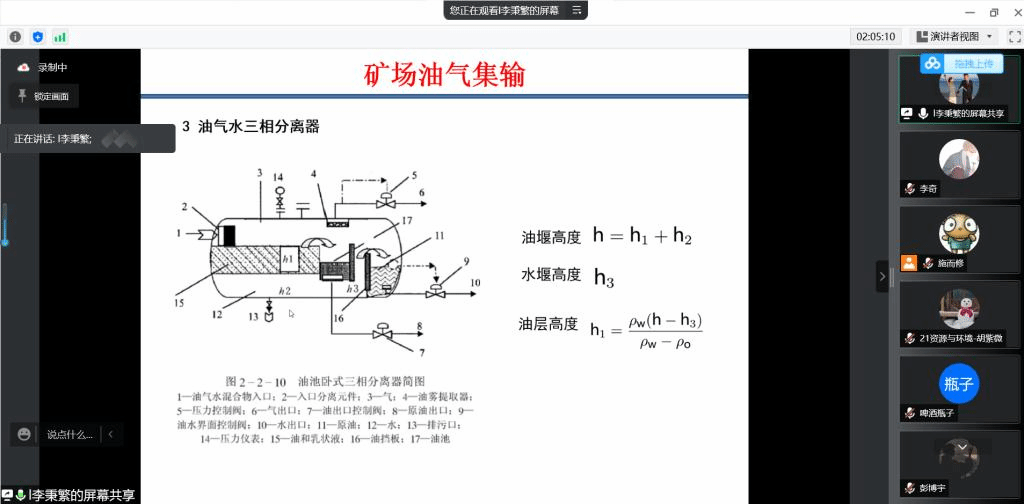 大赛地面工程设计单元由李秉繁老师讲解,首先介绍了地面储运工程的设计步骤,并结合实际数据和矿场集输要求,对输油气管道线路方案、油气水处理工艺等7个部分进行了细致讲授,着重提出了油气水三相分离器的使用建议与计算方法;同时,李老师用CO2驱实际开发案例指导同学们进行地面工程方案设计。李光辉老师对地面工程设计部分进行了补充,并号召同学们完成全部内容设计,不要缺项。