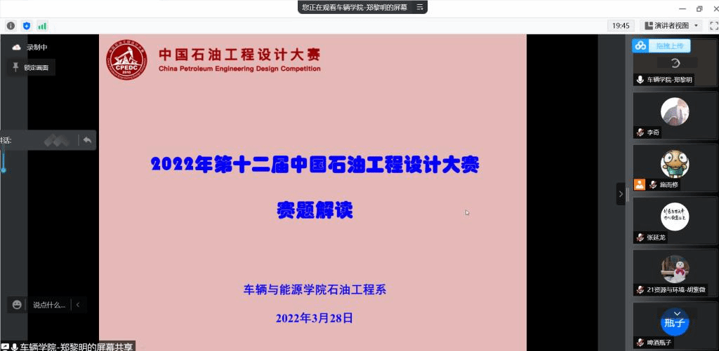 2022年3月30日19:00,基于第十二届“中国石油工程设计大赛”校内选拔赛,PA集团官网举办了钻完井工程、采油气工程、地面工程单元的线上指导讲座,帮助同学们深入解读不同设计单元的赛题内容。为遵守疫情防控需求,本次讲座通过腾讯会议线上开展,由施而修老师主持,PA集团官网石油工程系教师们共同讲解,六十余名报名参赛的本科生及研究生参与直播。