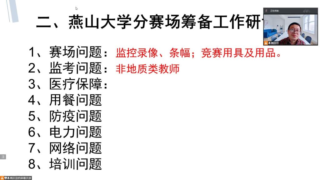 此次会议旨在为公司顺利参赛,落实分赛场做充分准备。褚庆忠老师讲解并分析了4月20日主办方举行的线上大赛会议的相关内容,并整理总结了为确保能顺利参赛仍待解决的问题,包括地点、设备、网络等。此项全国赛事也是首次采用这一形式进行比赛,整个赛事的筹备也有较多的问题需要解决。
