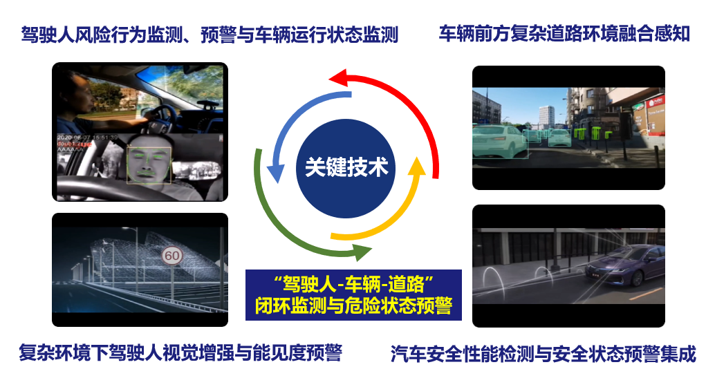 项目团队经过多年的“产学研用”协同创新,在车辆安全监测与预警技术领域实现了关键理论和技术瓶颈的突破,取得了一系列的创新性成果。项目主要围绕驾驶人行为监测与车辆运行状态监测、驾驶人风险状态预警、车辆前方复杂道路环境融合感知、复杂环境下驾驶人视觉增强与能见度预警、汽车安全性能检测与安全状态预警集成等关键技术开展创新性研究,形成了具有自主知识产权的核心技术体系。主要研究成果包括:(1)开发了集驾驶人生理信号采集、车辆运行状态监测与驾驶人状态辨识为一体的驾驶行为监测系统;(2)提出了智能车辆前方复杂道路环境融合感知方法,实现了对车辆前方动静态有效目标的准确识别与复杂场景中交通参与者的跟踪,以及对多个跟踪目标的轨迹预测;(3)研发了复杂环境下驾驶人错失交通标志的提醒系统和视觉增强、能见度预警系统,实现了符合国家公安部要求的大雾预警、距离预警、超速预警和能见度安全预警等多等级预警功能;(4)研发了汽车安全性能检测与安全状态预警集成系统,探究了车辆动态故障信息提取方法,解决了多参数交互作用下车辆运行危险状态辨识难度大的问题。项目研究成果为驾驶人提供了有效的预警信息,实现了对“驾驶人-车辆-道路”的闭环监测与危险状态预警。