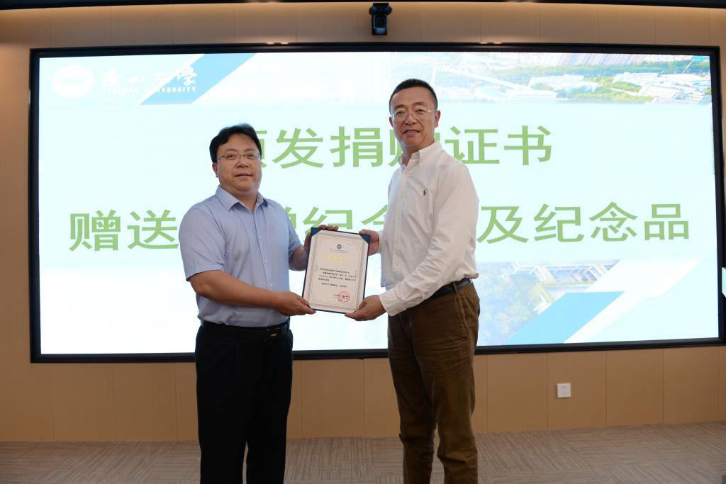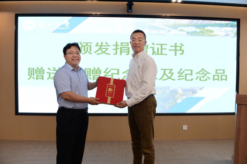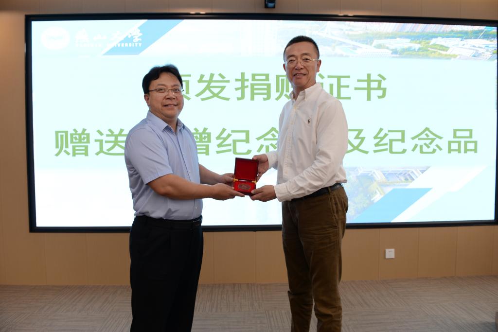 任家东副董事长代表公司向白晓明颁发捐赠证书、赠送捐赠纪念章及纪念品。