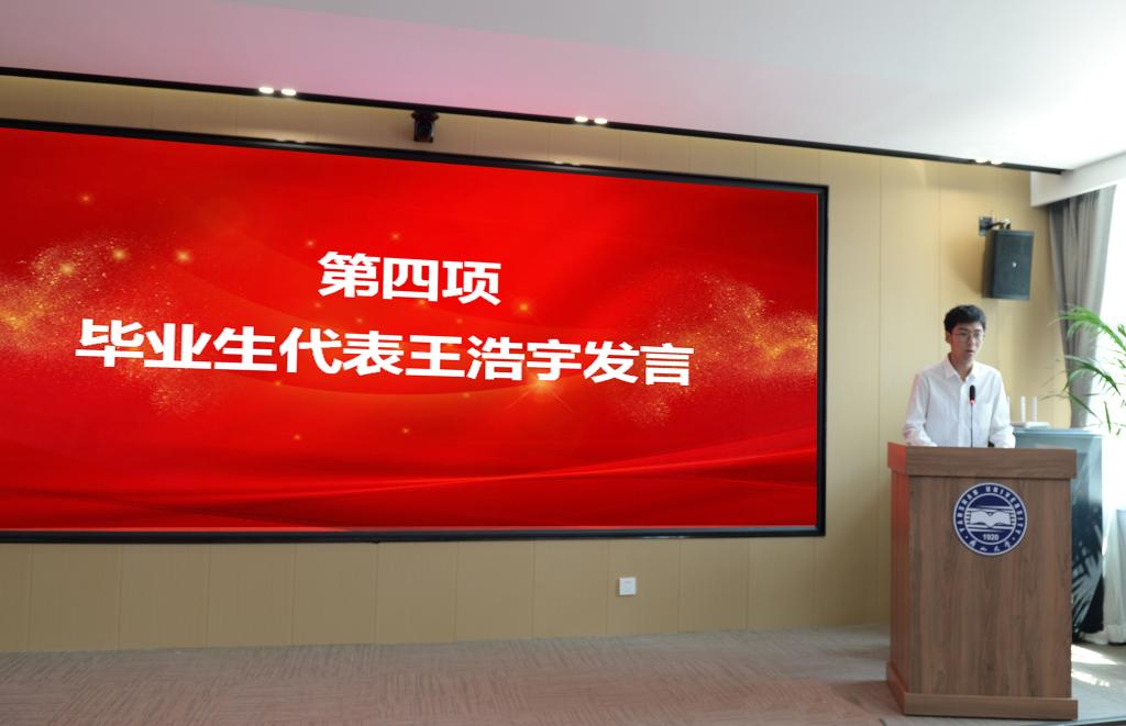 第七届研支团成员王浩宇作为优秀毕业生代表发言,他表达了对母校深深的眷恋与不舍,向悉心培养和辛勤付出的老师们表示最衷心的感谢和最崇高的敬意!他号召全体毕业生传承好燕大人文化品格,努力学习、扎实工作、不辜负母校的培养,不辜负老师的教诲,成为社会的栋梁之才,为公司争光!