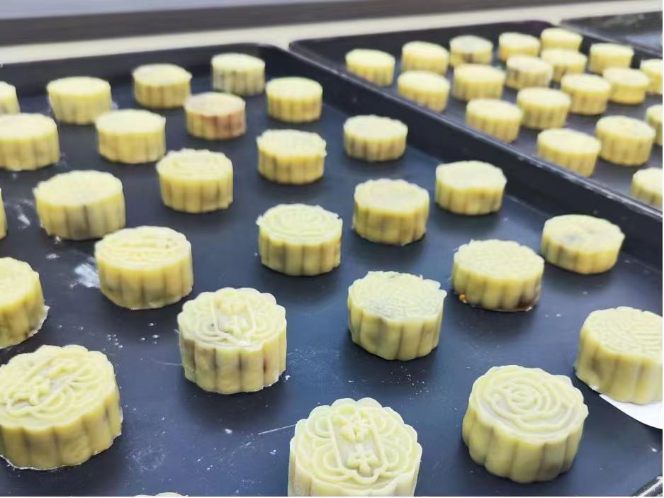 活动期间,老师们认真称量每一份材料,包馅儿、撒上面粉、放入模具、压实成型,一个个月饼便被制作了出来。
