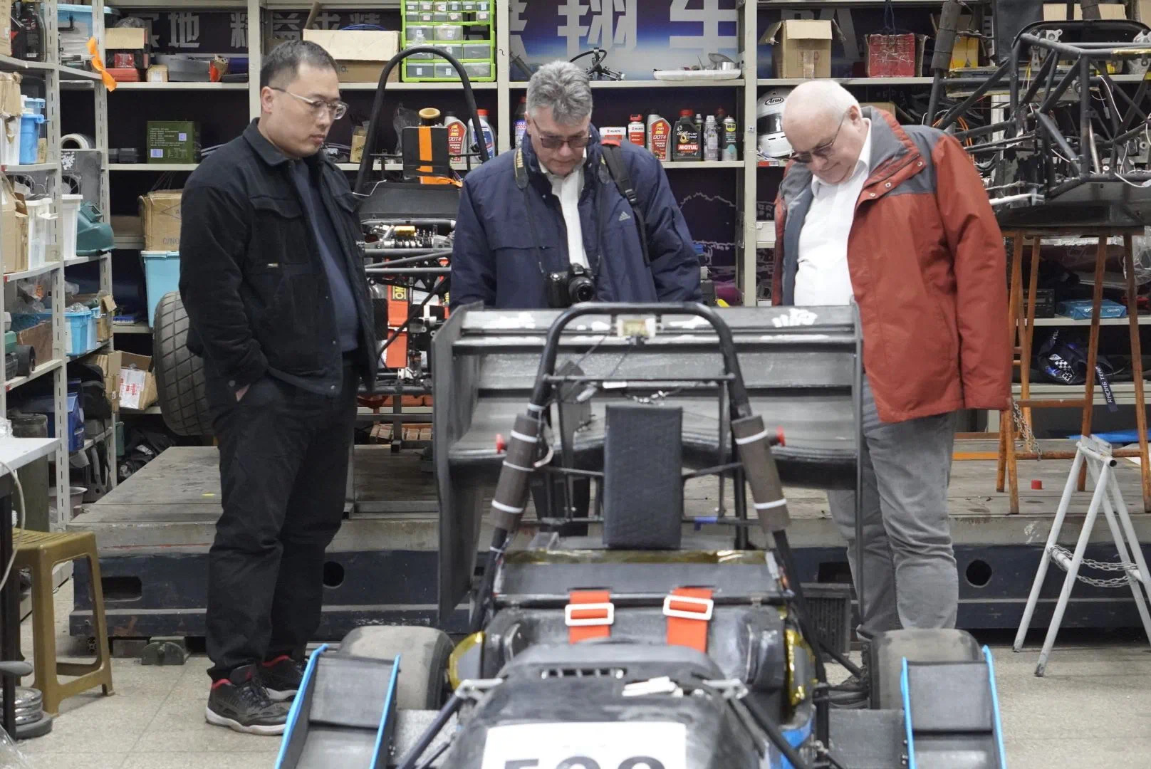 随后,两位教授来到燕翔车队的工坊参观,对方程式赛车的制造工艺和车队队员们的工作状态做出了高度评价。