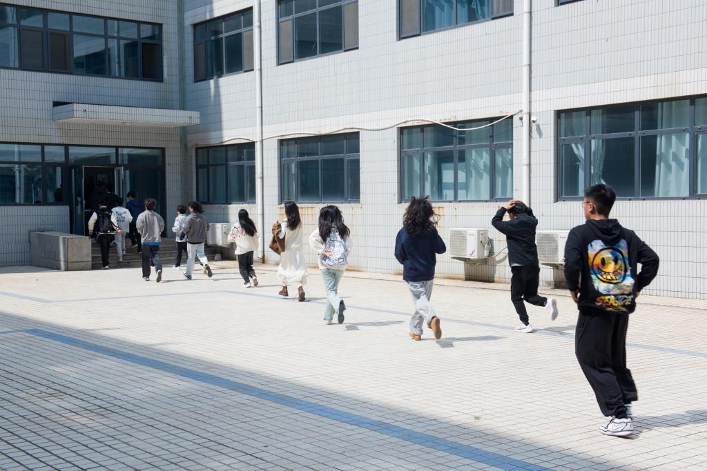 模拟地震发生时,参与演练的同学们有序的向室外“撤离”