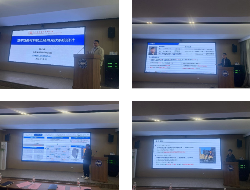 会上,吴小虎做了题为《基于双曲材料的近场热光伏系统设计》的特邀报告。来自香港理工大学、长安大学、中国科公司大学、同济大学、大连理工大学、江苏大学、中国地质大学北京校区等7名青年学者分别就自己的研究方向、研究课题、研究成果等方面分别进行分论坛学术报告。