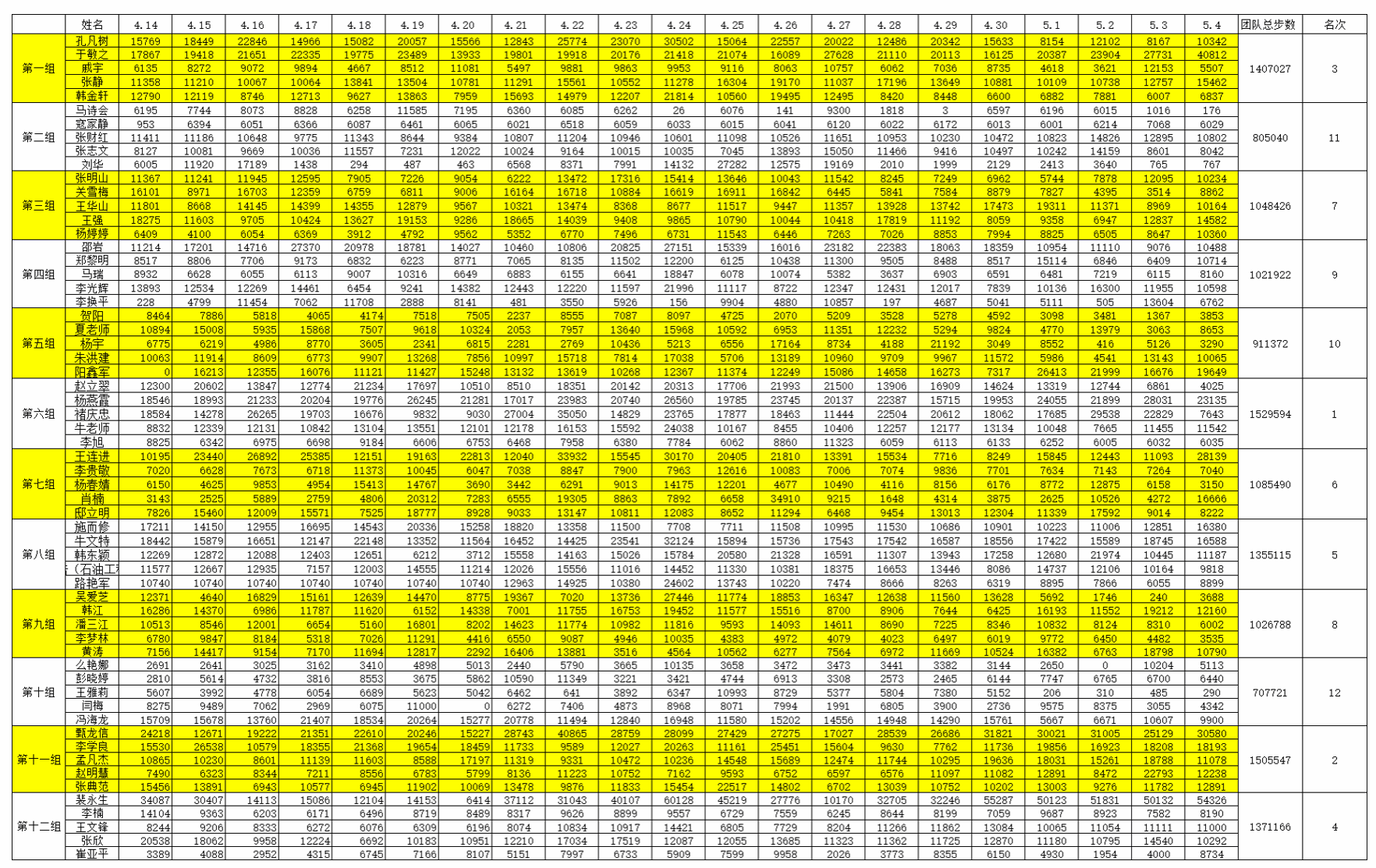 本次活动中第六组以总计步数152万步位居榜首!第十一组以总计步数150万步位列第二名!第一组以总计步数140万步位列第三名!各位教职工总计步数1444万步,累计步行公里数10108公里。