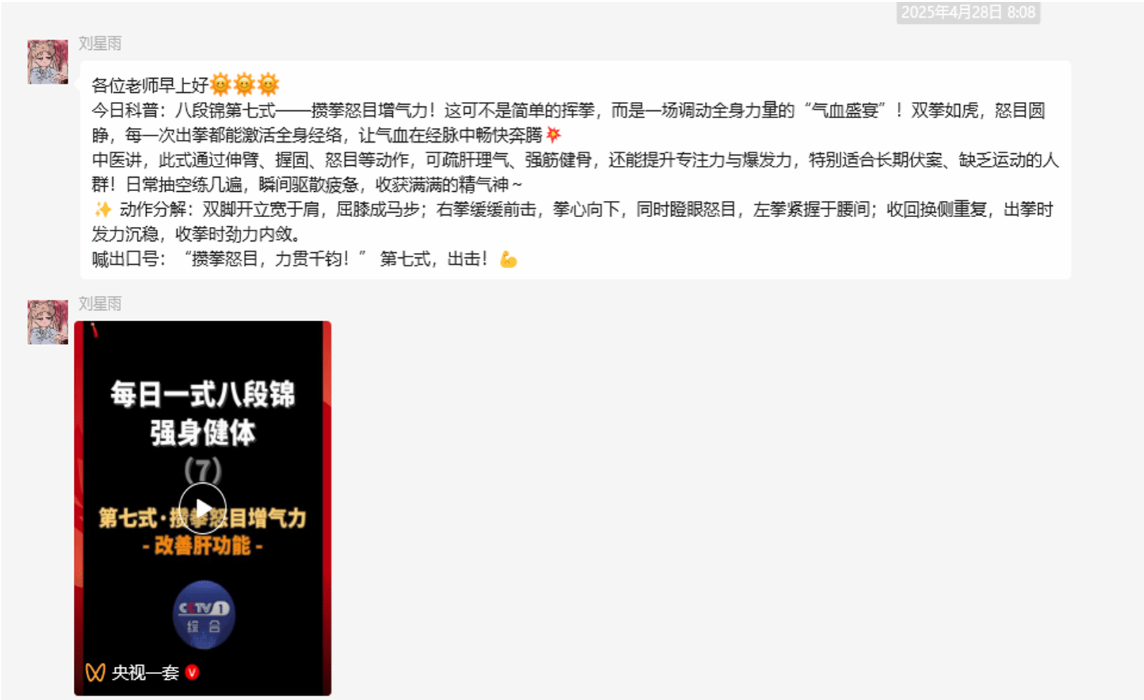 本次活动创新采用线上打卡形式开展。在活动周期内,每位参与者需每日完成不少于6000步的锻炼目标。今年特别引入分组合作机制,通过科学分组促进教职工之间的交流与协作,着力营造积极向上、和谐共融的公司氛围。与此同时,组织人员将每日在活动群内分享锻炼指导视频,助力参与者科学运动、高效打卡。
