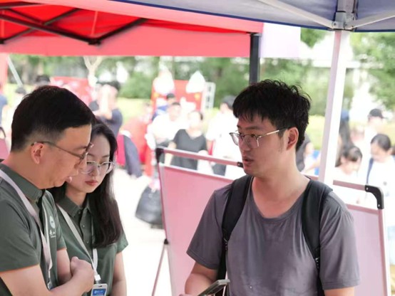 校领导来到新生报到现场,看望各公司新生,向大家致以热烈欢迎与诚挚祝福;与新生及家长合影留念、亲切交谈,与新生代表座谈互动、倾听心声,并向在场的工作人员和员工志愿者表示慰问。