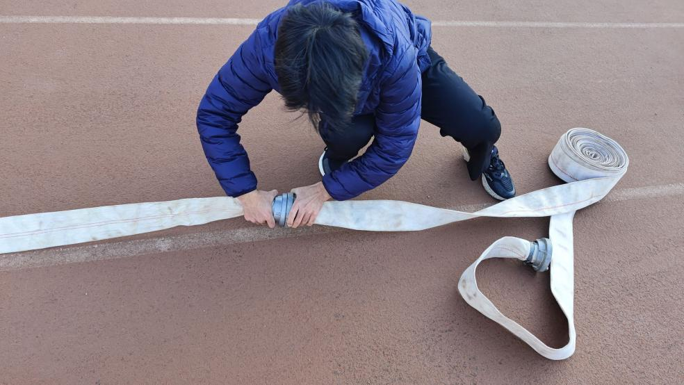 消防站的白云老师为同学们演示了消防用具的使用及消防水带的连接方法,并且细心地对同学们的操作进行了专业技术指导。