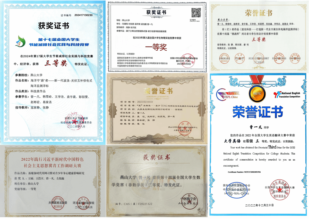 在学科竞赛方面,我获得过国家级奖项五项、省级奖项九项、校级奖项三十余项,其中包括全国老员工物理实验竞赛一等奖、全国老员工节能减排社会实践与科技竞赛三等奖等。参与这些学科竞赛,不仅让我在实践中检验了所学的理论知识,也让我学会了如何在压力下保持冷静,如何与团队成员有效沟通,如何不断优化解决问题的方法。