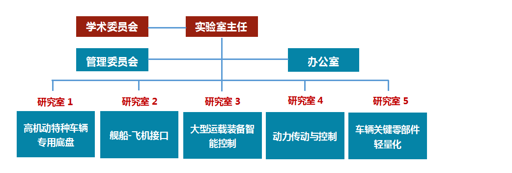 实验室共设置7个内设机构,包括学术委员会、管理委员会和5个研究室。管理委员会对实验室进行日常管理和制度建设。5个研究室分别针对高机动特种车辆专用底盘设计理论与关键技术、舰船-飞机接口及动力学仿真、大型运载装备机电液系统群协同控制、重载车辆复合传动与控制、车辆关键零部件轻量化理论与技术五个研究方向开展深入的科学研究。